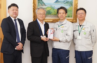 9月24日(水)、当社に設置している自動販売機の売上金の一部を花巻市社会福祉協議会へ寄付致しました。サントリービバレッジサービス(株)の協力の下、1本販売する毎に10円を寄付する仕組みの自動販売機を花巻市内の各工場に設置し、1年分の総額44万円を寄付したものです。今年で11回目となり、寄付金の総額が516万円となりました。