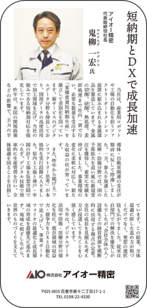 2026.01.07 岩手日報「2026年トップインタビュー 新時代を駆ける 岩手のリーダー」掲載のお知らせ 岩手日報2026年1月1日朝刊「2026トップインタビュー 新時代を駆ける 岩手のリーダー」に、弊社代表取締役社長 鬼柳一宏のインタビューが掲載されました。