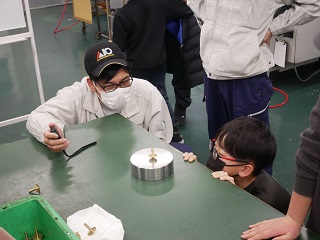 工場見学後は、自分で考えて決めたサイズの金属のコマをつくり、回し方を練習したうえでどの位回転していられるかを楽しく競い合いました。